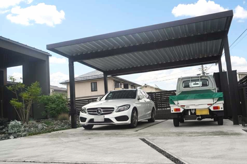駐車スペースには、車2台が余裕をもって停められるカーポートを設置。コンクリート仕上げで、雨の日も滑りにくく安心です。その奥には、全体の印象を損なわないスタイリッシュな物置を配置しました。カーポートの奥にあるので、荷物の積み下ろしもスムーズです。