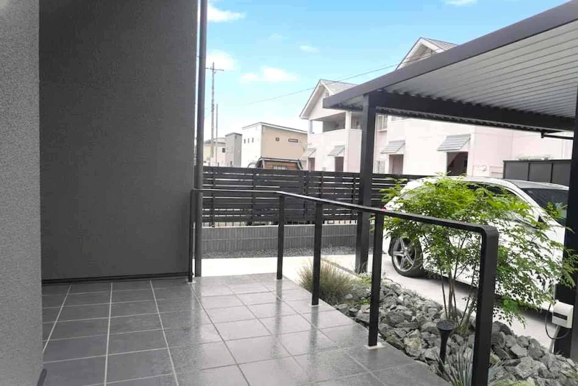 玄関アプローチには手すりを設け、お隣に住むご家族の行き来も快適に。モダンな印象を保ちながらも、丸みを帯びたシルエットでやさしさとかわいらしさをプラスしました。
