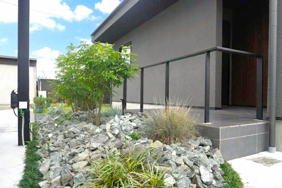 ロックガーデンの緑が映える シンプル&モノトーンなエクステリア